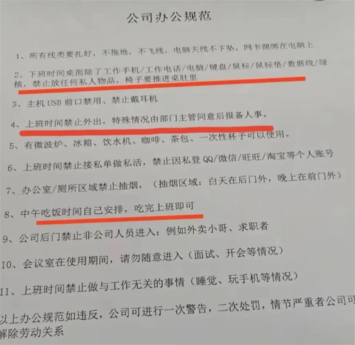 有员工在接受采访时表示,在午休期间吃午餐时,佩戴耳机,用个人手机刷短视频,负责人告诉她,行为违反公司规定。在午休时段,员工仍被禁止离开公司用餐,只能自带餐食或将外卖带回工位食用。